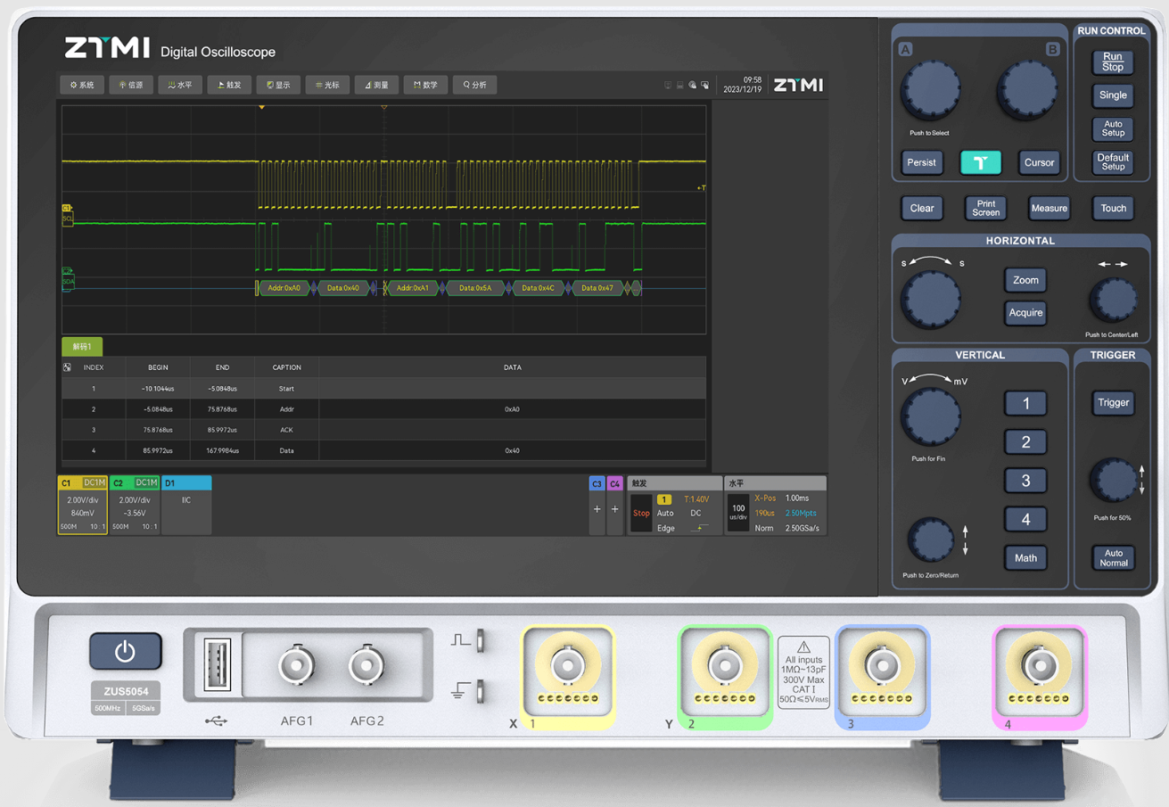 ZDS5054 系列以 “高速采样 + 深度分析” 为核心,通过超大存储、丰富协议解码、电源专项功能,显著提升工程师在复杂信号调试中的效率,尤其适合对时序精度、偶发信号捕获、电源稳定性分析有高要求的研发与生产场景。