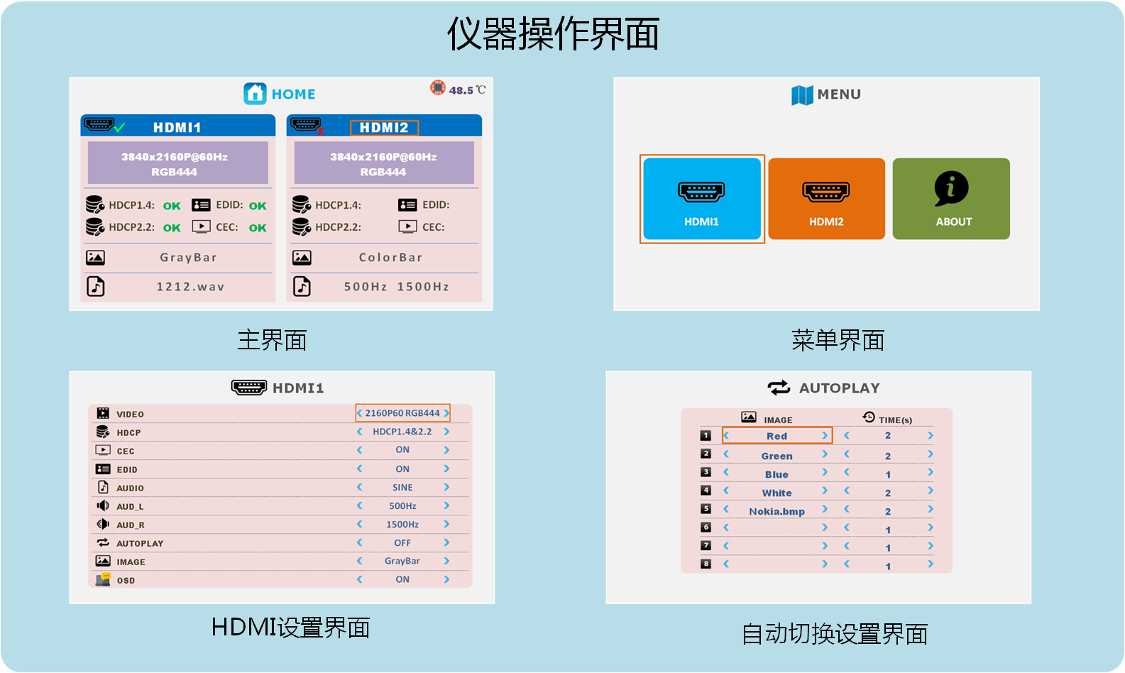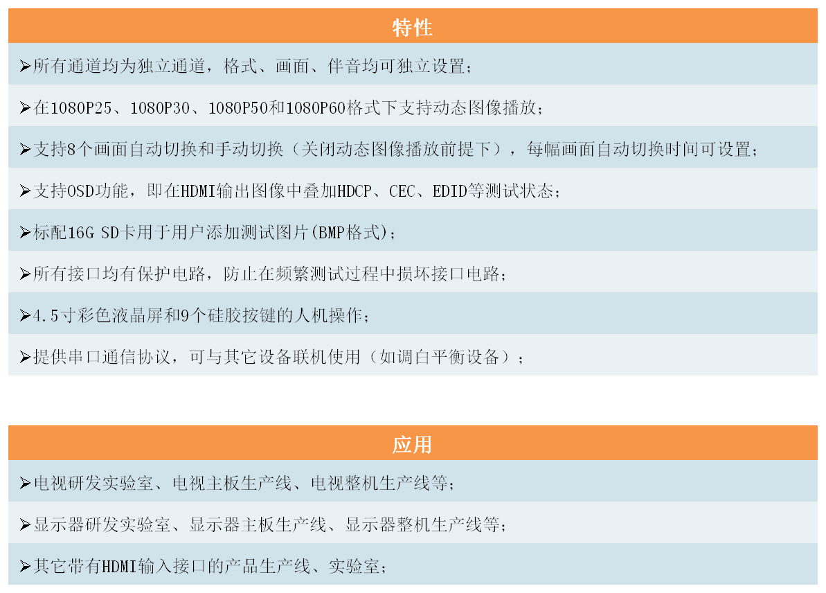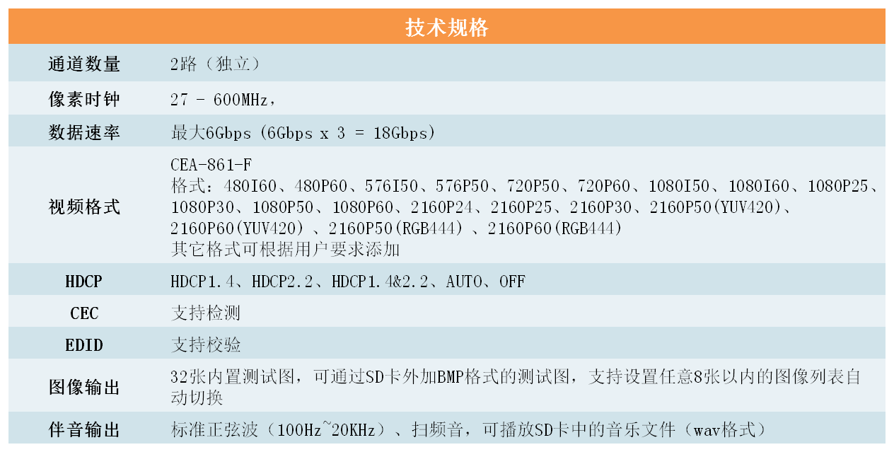 DvBei DB-8500和DvBei DB-8501/SVG-202 4K双通道 HDMI2.0 信号发生器,用于电视机和显示器主板生产线、整机生产线的HDMI接口信号测试,包含2通道HDMI2.0接口,均向下兼容HDMI1.x,且为独立接口,格式、画面、伴音均可独立设置,所有接口均有保护电路,高可输出4K2K RGB444 60Hz的图像,支持HDCP1.4和HDCP2.2,支持CEC检测;内置算法多可产生32张测试图,用户可通过SD卡添加自定义测试图。