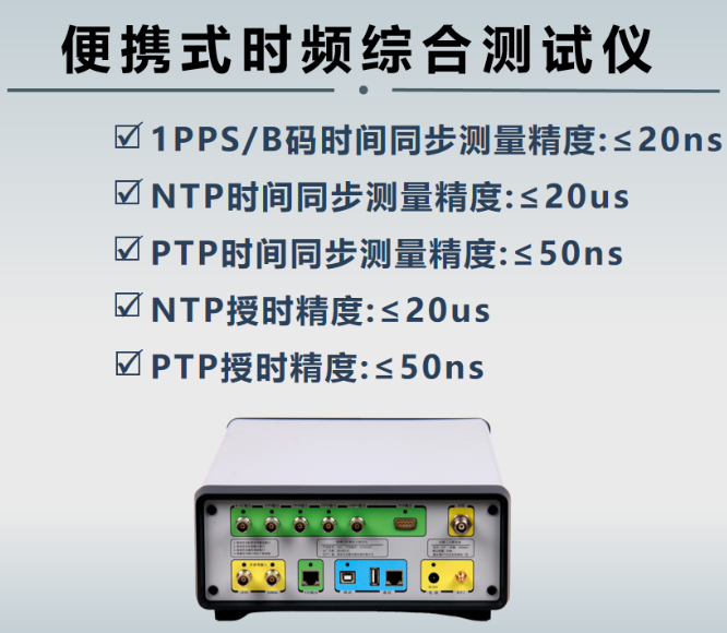 测量能力:可测量 1PPS、B-DC 码、NTP、PTP 信号的授时精度,同时支持频率信号的稳定度与准确度测量;